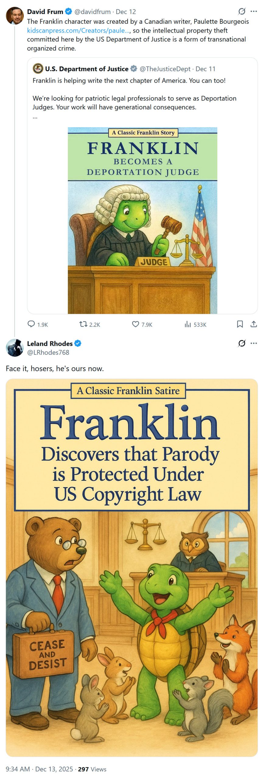 IT’S FRUM TO THIS: David Frum Explains Why DOJ’s Use of ‘Franklin’ Parody Is a Form of Transnational Organized Crime. “The Atlantic’s David Frum comes across like he’s just been hired as Franklin’s attorney with this assessment of what the Justice Department has done by sharing that meme…As you might have guessed, Frum’s post on the speculative legal aspects of the Trump administration’s ‘Franklin’ memes had the immediate opposite effect:”
