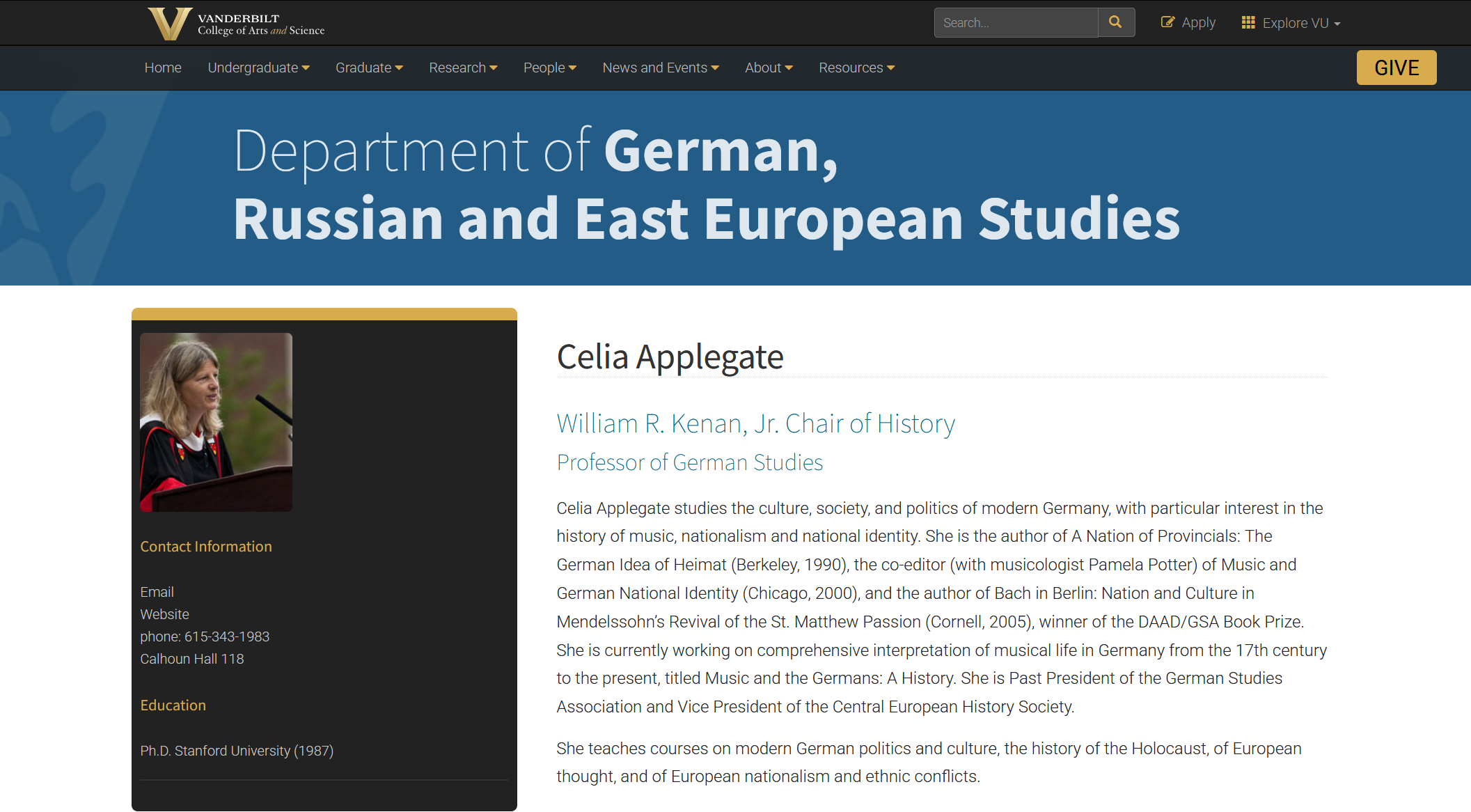 Here’s the Webpage for Celia Applegate, Professor of German Studies at Vanderbilt: