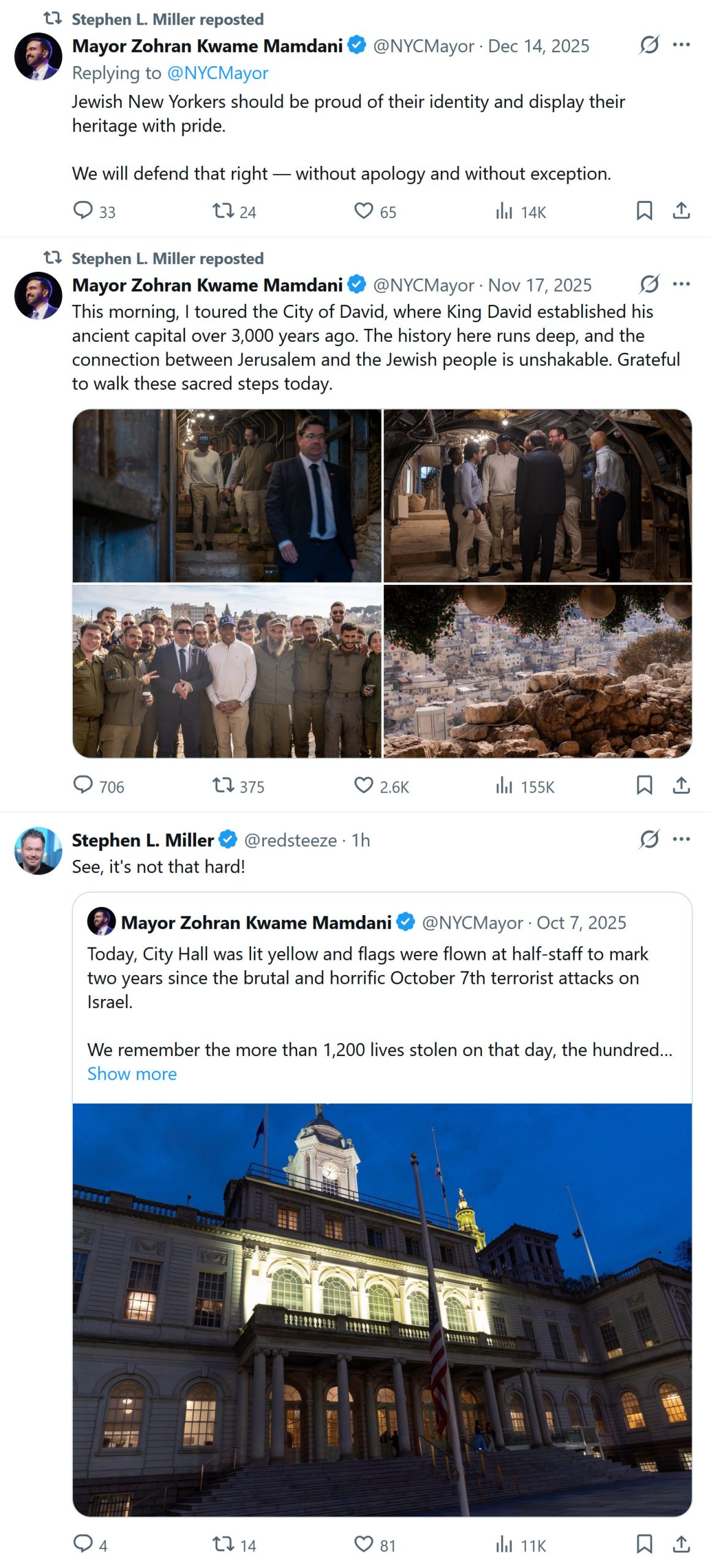 Yashar Ali, a journalist, in a post on X viewed over 400,000 times: “The NYC Mayor’s Twitter account is now under Mayor Mamdani’s name, but unlike the White House accounts, prior tweets are not archived or clearly attributed to past administrations. As a result, there are tweets still visible that are jarring when they appear under Mayor Mamdani’s name—even though they were posted before he took office.”