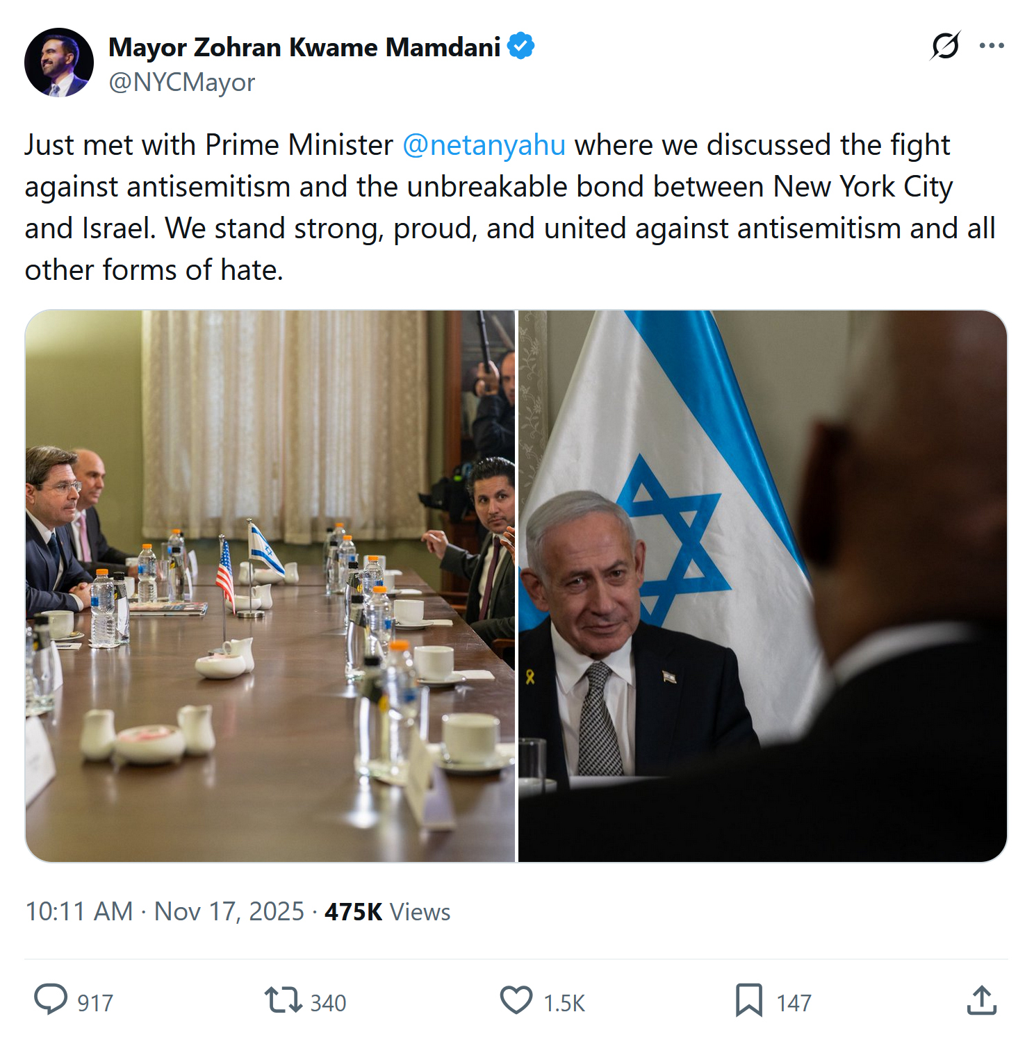 Rowan Scarborough, a columnist for The Washington Times, in a post on X: “For the record, Mamdani condemned Netanyahu when he appeared at UN and accused him of genocide. NYC needs to update its social media management.”