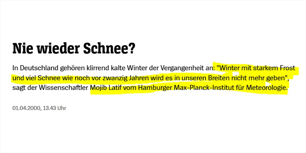 More than two decades ago, renowned climate scientist Mojib Latif of Germany’s Max Planck Instiute for Meterology, based in Hamburg, warned the climate-ambulance chasing Der Spiegel that, due to global warming, Germany would likely no longer experience harsh winters with heavy frost and snow as it had in previous decades.