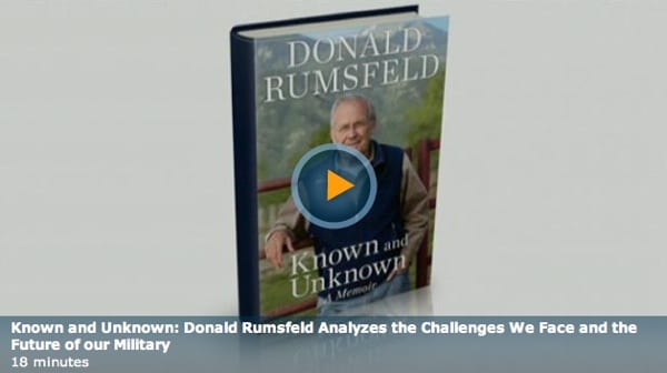 PJTV: My interview with Donald Rumsfeld. It was supposed to be a two-parter, but the producers left it in one piece after all: “It just seemed to flow naturally.” We talk about his new book, Known and Unknown: A Memoir, now a #1 bestseller, about why the Bush Administration changed its stance on pushing democracy in 2005, civil-military relations, and how the United States should be responding to events in Libya, Egypt, Saudi Arabia, Iran, etc. (Bumped).