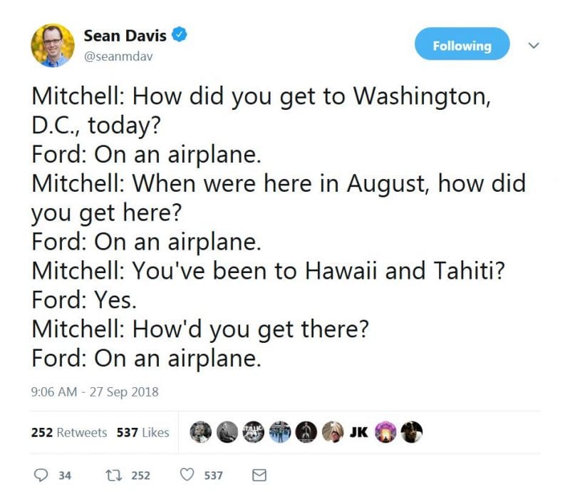 More: “The very first question, and Ford broke in to retract her previous written allegation that there was another “bystander” to the assault. She now says she misused the word, and that the “bystander” was actually downstairs — and therefore not a witness to anything.”