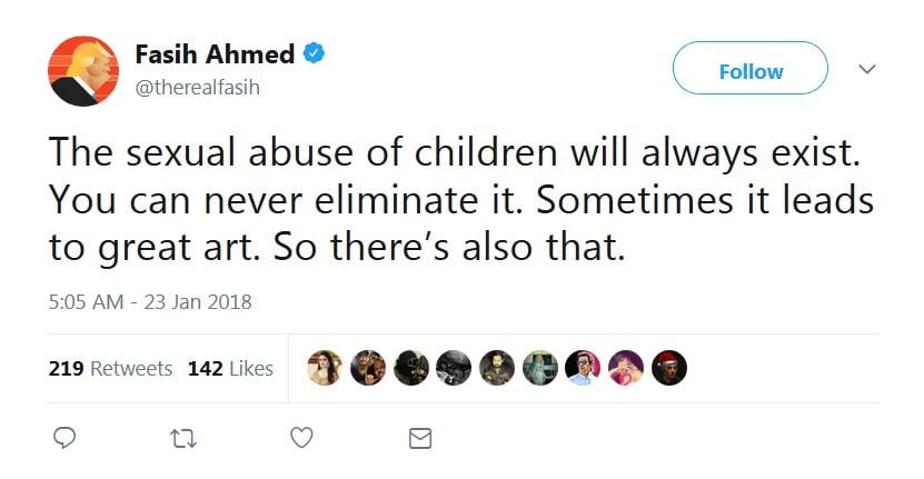 Shortly afterwards the journalist attempted to climb down from his position with a public apology, writing of his now-deleted messages: “My tweets of yesterday were coming from anger, were poorly phrased, and misread. I’m sorry to have upset the people who have survived child abuse. I have been angry at the conspiracy of silence around this evil. #MeToo #StopChildAbuse”