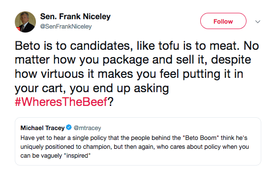 HE’S NO TED KENNEDY — BUT HE’S WORKING ON IT: Beto O’Rourke Overtakes Biden As Dem’s Top 2020 Candidate In New Poll. “You can be a failed Senate candidate with not much in the way of accomplishments except a bad rap for stealing land from the poor and trying to flee a drunk driving incident, and STILL be the number one choice for Democrats in 2020.”