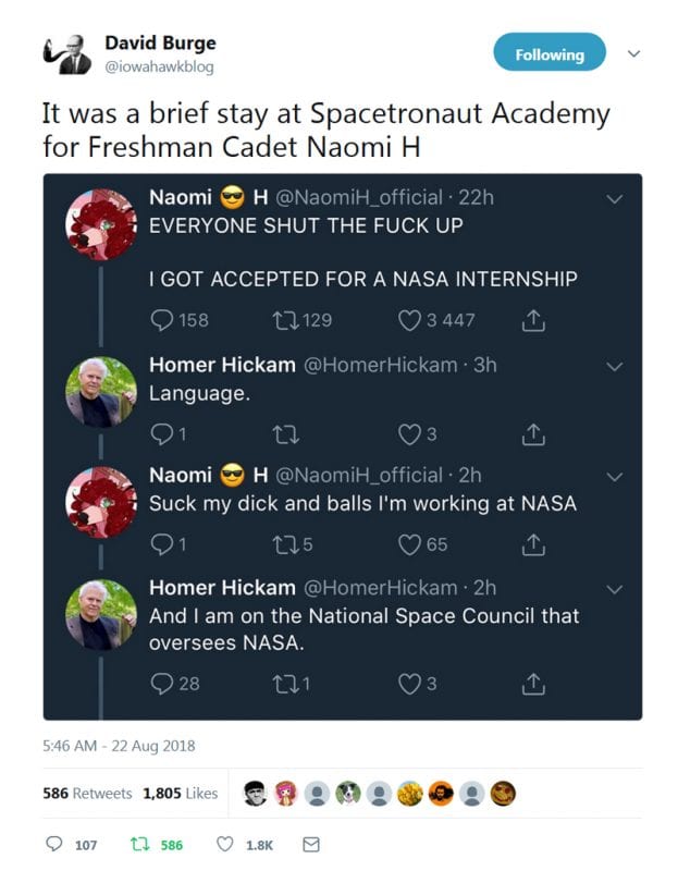 AYN RAND DIDN’T INTEND THE RETURN OF THE PRIMITIVE TO BE A HOW-TO GUIDE: “A Woman Apparently Lost Her Internship At NASA For Telling Homer Hickam To ‘Suck My Dick And Balls,’” BuzzFeed* reported on Wednesday, adding, “Naomi’s Twitter avatar appeared to indicate she was a furry, which has been the focus of many when discussing this story and the privacy she should of had on a personal Twitter account,” and that “Hickam said the woman apologized, and he approached NASA about getting her job back.” As NRO’s Jim Geraghty tweeted when the story broke, “You know, maybe it’s time everyone retired their edgy, in-your-face, no-holds-barred social media personas and just went back to old-fashioned polite decorum, and kept the smack-talk offline.”