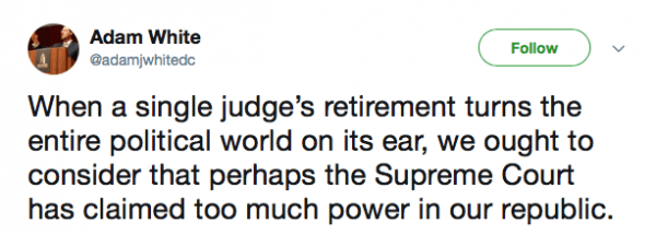 As Adam White of the Hoover Institute tweets, “When a single judge’s retirement turns the entire political world on its ear, we ought to consider that perhaps the Supreme Court has claimed too much power in our republic.”