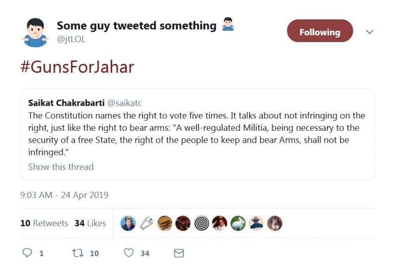 NEW SOCIALIST “IT GIRL” CONTINUES TO PAY DIVIDENDS: AOC’s Chief of Staff Backs the Boston Bomber Voting Brigade, Wants Those Affected by ‘Unjust Laws’ to Vote. And goes all the way with his argument, as Jim Treacher spots: