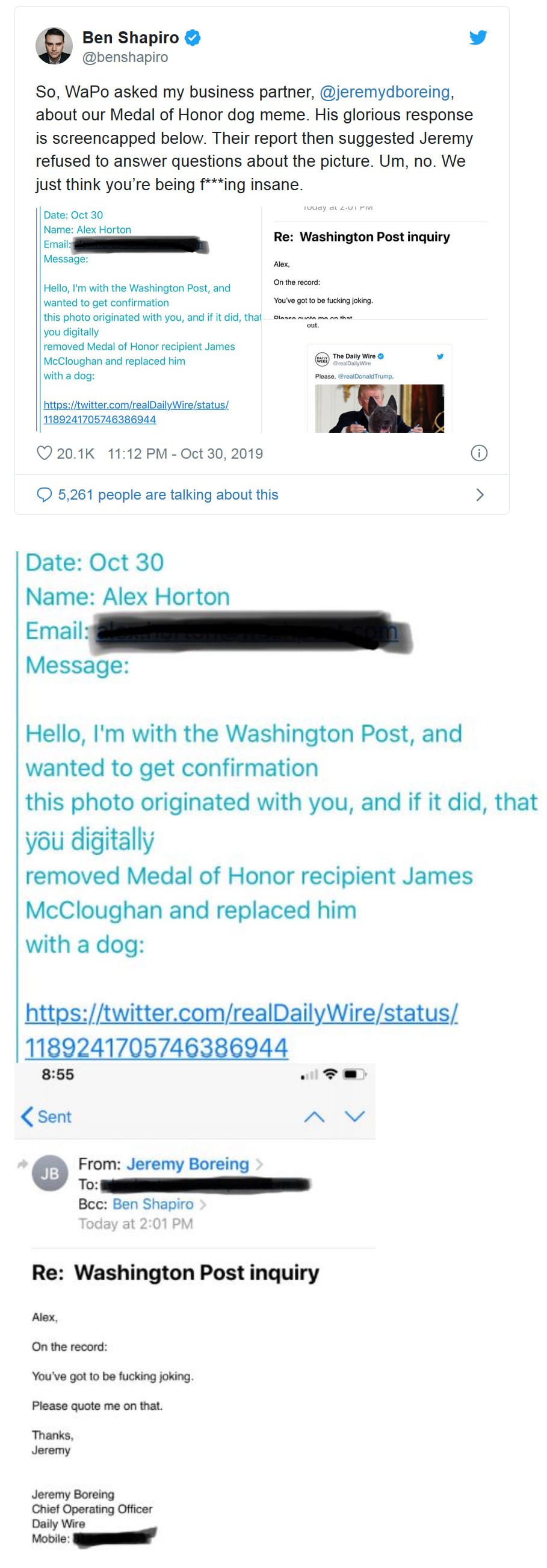 Now, I’m no expert on photographs or photography, but I took one glance at that and concluded it’s obviously not a real photo, and obviously not meant to be mistaken for one. See the “@realDailyWire” watermark in the lower-right corner? That’s Ben Shapiro’s site. Somebody at the Daily Wire took an old picture of Trump awarding somebody a medal, and then crudely Photoshopped in the picture of the dog that helped track down al-Baghdadi. Everybody loves the hero dog, so here’s a meme about the dog. Hooray for that awesome dog! It’s not meant to deceive. It’s meant to be enjoyed.