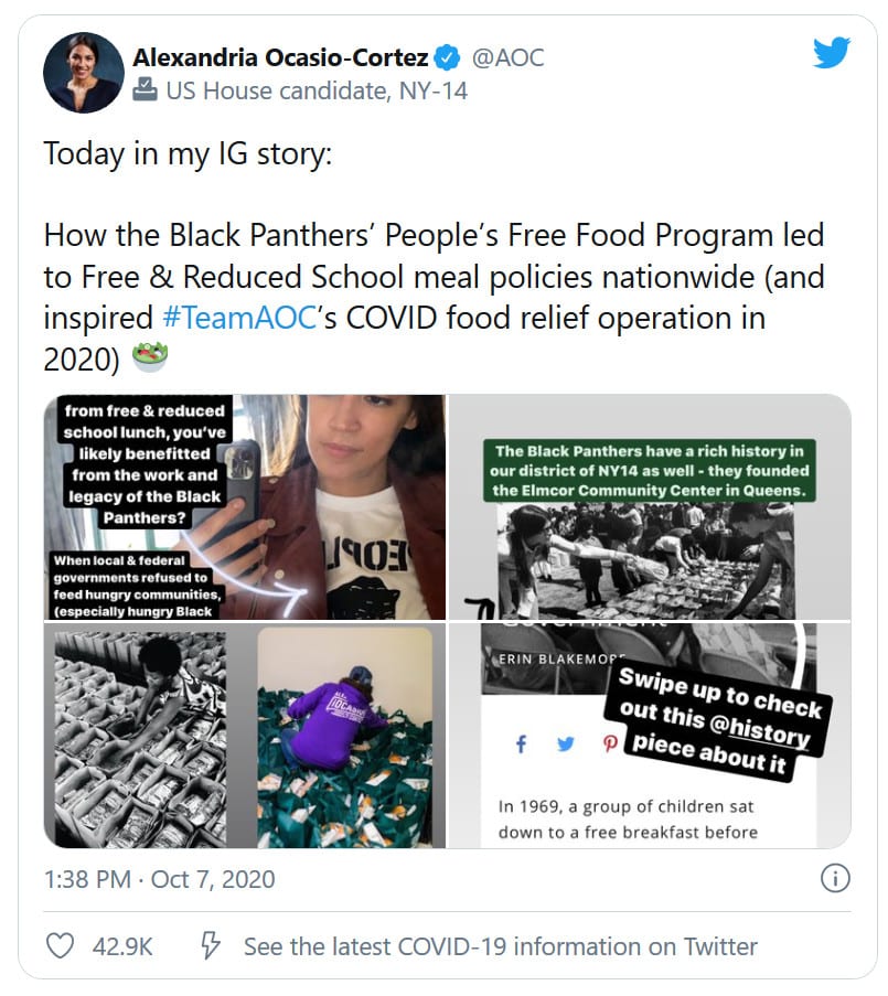 “Did you know: If you or anyone you know ever benefited from free & reduced school lunch, you’ve likely benefited from the work and legacy of the Black Panthers?” Ocasio-Cortez said in the post to her Instagram story.