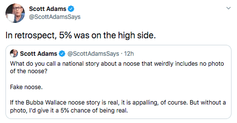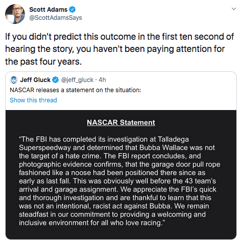 So, yeah, it was a garage pull that had been there since 2019. While this might not be a Jussie Smollett-like hate crime hoax, it’s nevertheless an unfortunate situation. Bubba Wallace may have jumped to the wrong conclusion upon seeing the garage pull, or he saw it and decided to take advantage of the current racial hypersensitive climate to pronounce himself a victim. I want to give Wallace the benefit of the doubt here, but it’s difficult to do that when Wallace seemed so determined to play the victim, and said those who questioned the story were “simple-minded.”