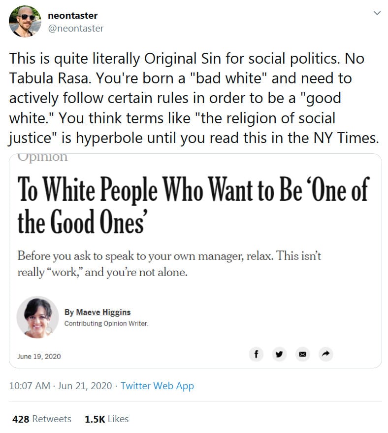 Education Week’s “Classroom Q&A” blog tells teachers that “As Dr. Ibram X. Kendi would say, there is no ‘not racist.’ There is only racist and anti-racist. Your silence favors the status quo and the violently oppressive harm it does to black and brown folk everywhere.” Antiracism, in the current formulation, does not mean equal treatment of others; it is an all-encompassing ideology that demands constant questioning of one’s own actions and motives and the actions and motives of others, with total vigilance about one’s own purportedly implicit racial biases.