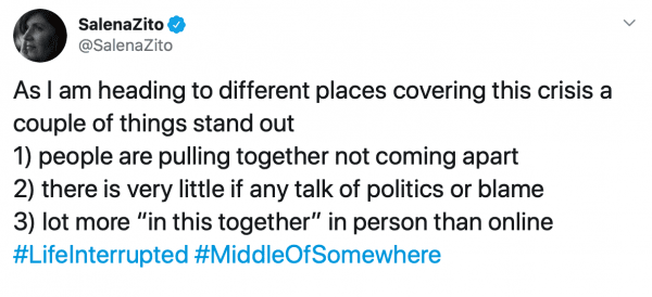 This is life in America, interrupted. Aside from the older gentleman who groused about having to pay his water bill in a slot and not in person, people were doing what they had to keep themselves and their community safe.