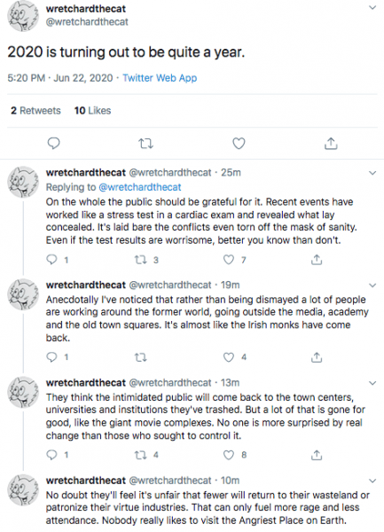 With those rules in mind, enjoy what happened in Tulsa when a mostly white group of Black Lives Matter protesters showed up at the Trump rally. The video begins when a white guy wearing the de rigueur leftist virtue mask (his has “BLM” emblazoned across it), and a t-shirt saying “I know words. I have the best words – Stable Genius,” spots a man who looks Hispanic. The white guy seems shocked that a Hispanic man is selling Trump merchandise while wearing a Trump hat and a t-shirt with a “God Guns and Trump” logo.