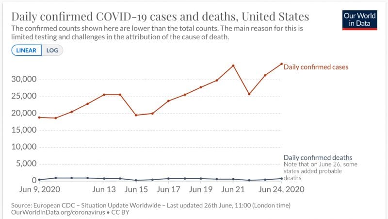 Related: Heather Mac Donald: Where Are The Deaths? “In May, Georgia was the main target of expert contempt for its allegedly premature reopening. Since then, the media have gone silent, due to the state’s truly discouraging downward daily death toll from a high of 119 on April 7, long before the reopenings, to 10 on June 24. . . . There are no crises in hospital capacity anywhere in the country. Nursing homes, meat-packing plants, and prisons remain the main sources of new infections.”
