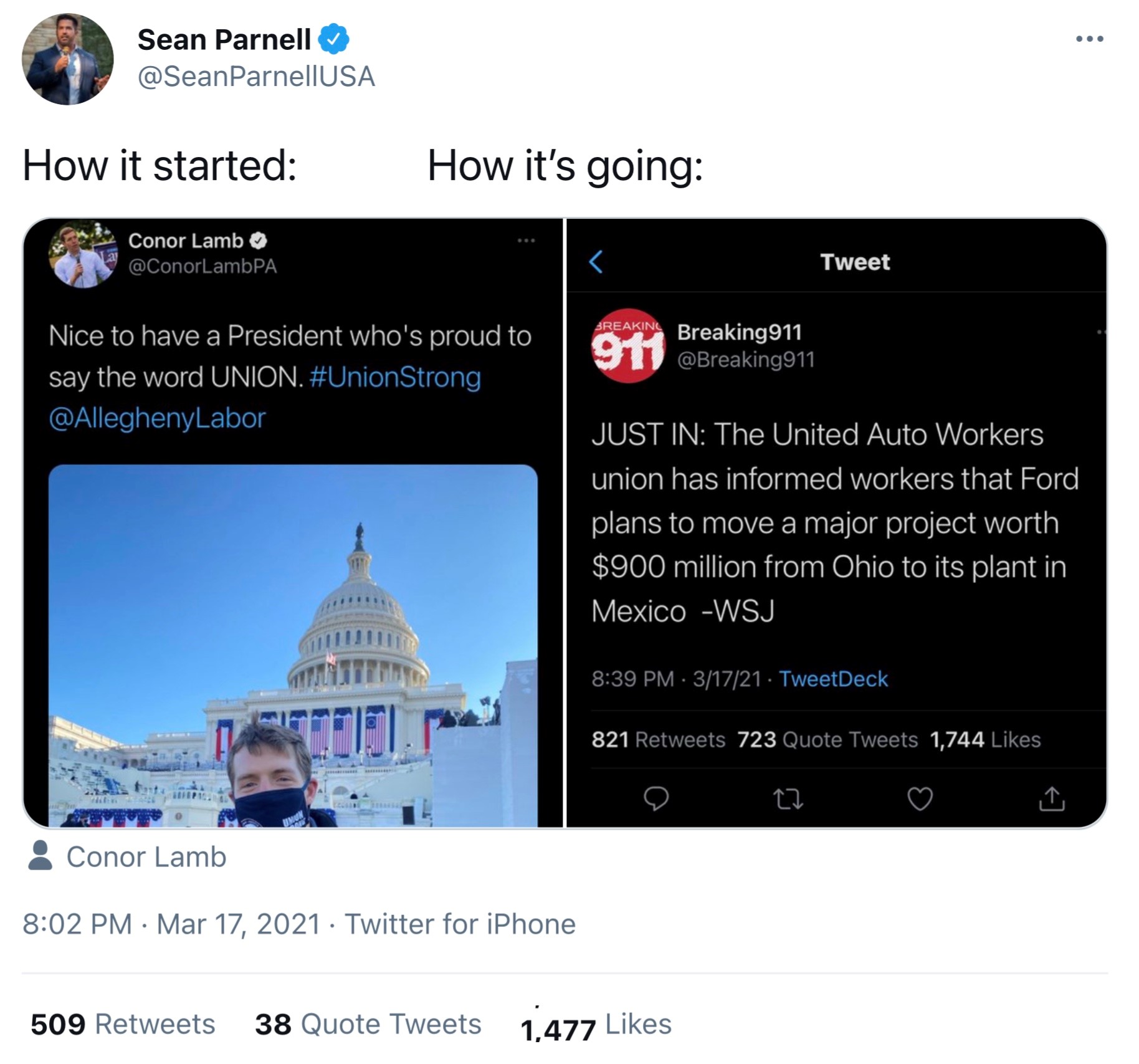 BIDEN VOTERS POSTING THEIR L’S ONLINE: Ford plans to move future vehicle production out of Ohio and to Mexico.