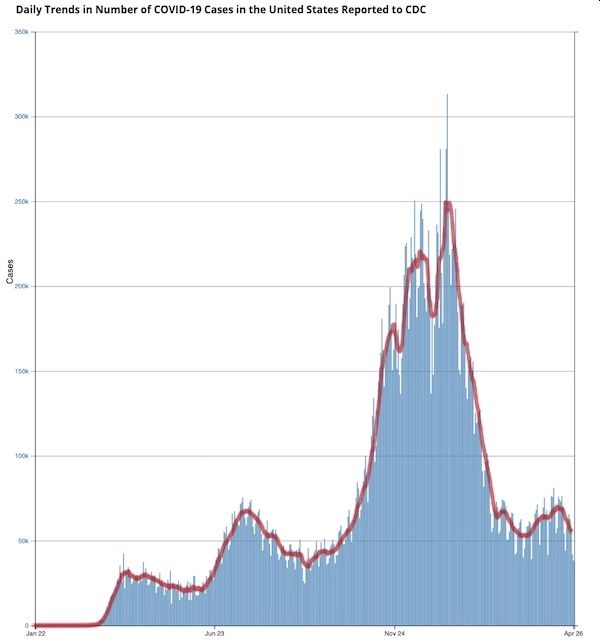 This is utter nonsense. It’s true that the seven-day average sits at just over 55,000 cases a day. It’s also true that it peaked at 247,000+ cases per day as the vaccination campaign began. The CDC charts this on an ongoing basis, and it’s tough to look at this chart and not see a “dramatically” decreased daily case load: