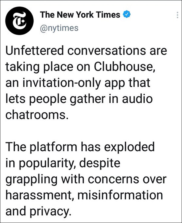 As Glenn Greenwald wrote on Sunday, “In other words, journalists, desperate for content, have flagged Clubhouse as a new frontier for their slimy work as voluntary hall monitors and speech police.”