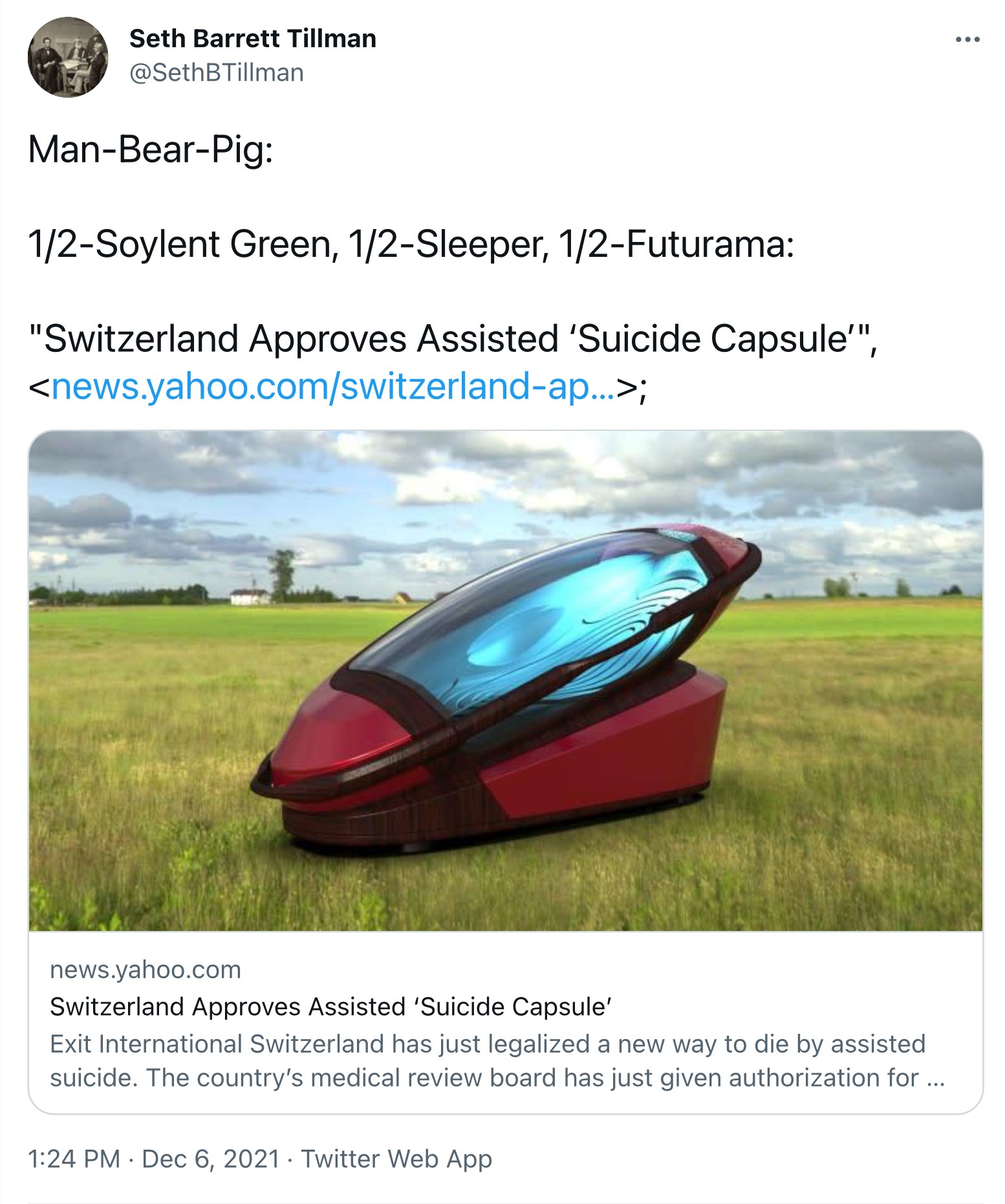 TO BE FAIR, THIS REALLY WAS THE FUTURE I WAS PROMISED IN THE 1970s: Controversial ‘suicide pod’ that ‘kills peacefully’ gets go-ahead in Switzerland.