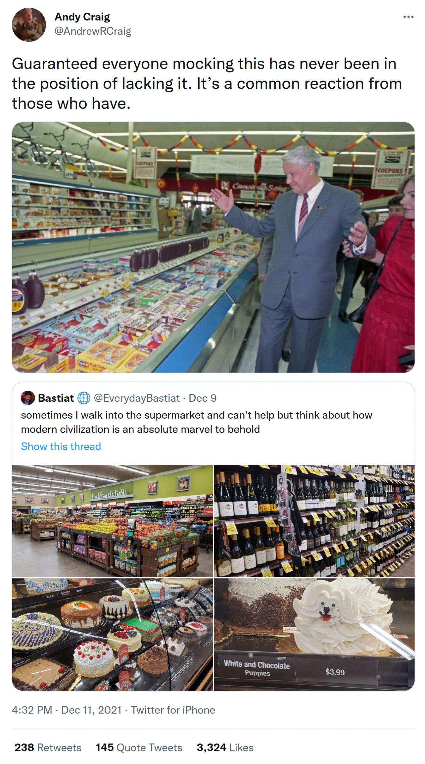 What you see is a miracle. This is the pinnacle of civilization, in its own way. No king in the history of mankind had access to riches like this. Look — here. (picks up box of special expensive gourmet crackers) This is someone’s livelihood. Someone got a loan, started a business, hired people, paid someone to design this, because he or she wanted to make a special cracker, and here it is next to all the other special crackers, and this is just the special cracker department in the cheese department. There’s another special cracker section in the cracker aisle. He might fail, he might win, but you can do that here, you can try. And if someone says why do we need so many cracker choices, this is why. Do you want some governing Cracker Bureau to say no, don’t make crackers, make pretzels. But I don’t want to make pretzels. I want to make crackers. Sorry, we have enough crackers. But I have this new taste. SORRY.