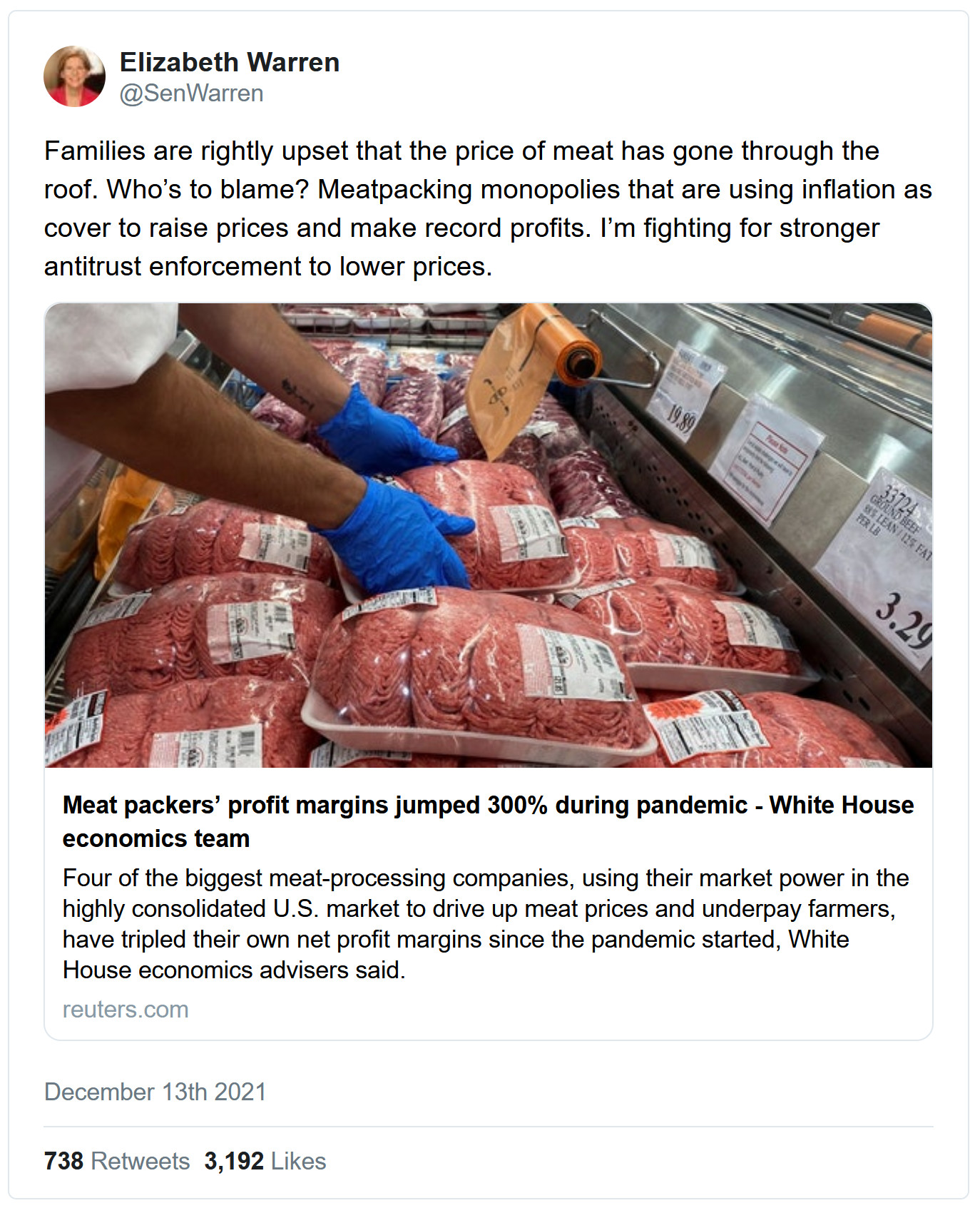 “That’s right: Liz Warren is going to beat Big Meat,” Treacher adds. And so is Peppermint Psaki! “Jen Psaki reveals that meat’s gotten so pricey because those sneaky ‘meat conglomerates’ decided to get greedy after Biden took office (video).