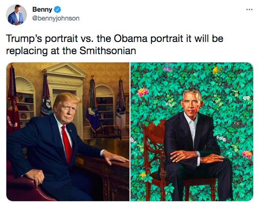 TO BE FAIR, OBAMA SET THE BAR LOW: Trump’s Official Smithsonian Portrait Unveiled and It’s Everything You Wanted It to Be. Well, he’s not riding a velociraptor while firing a machine gun, but it’s not bad.