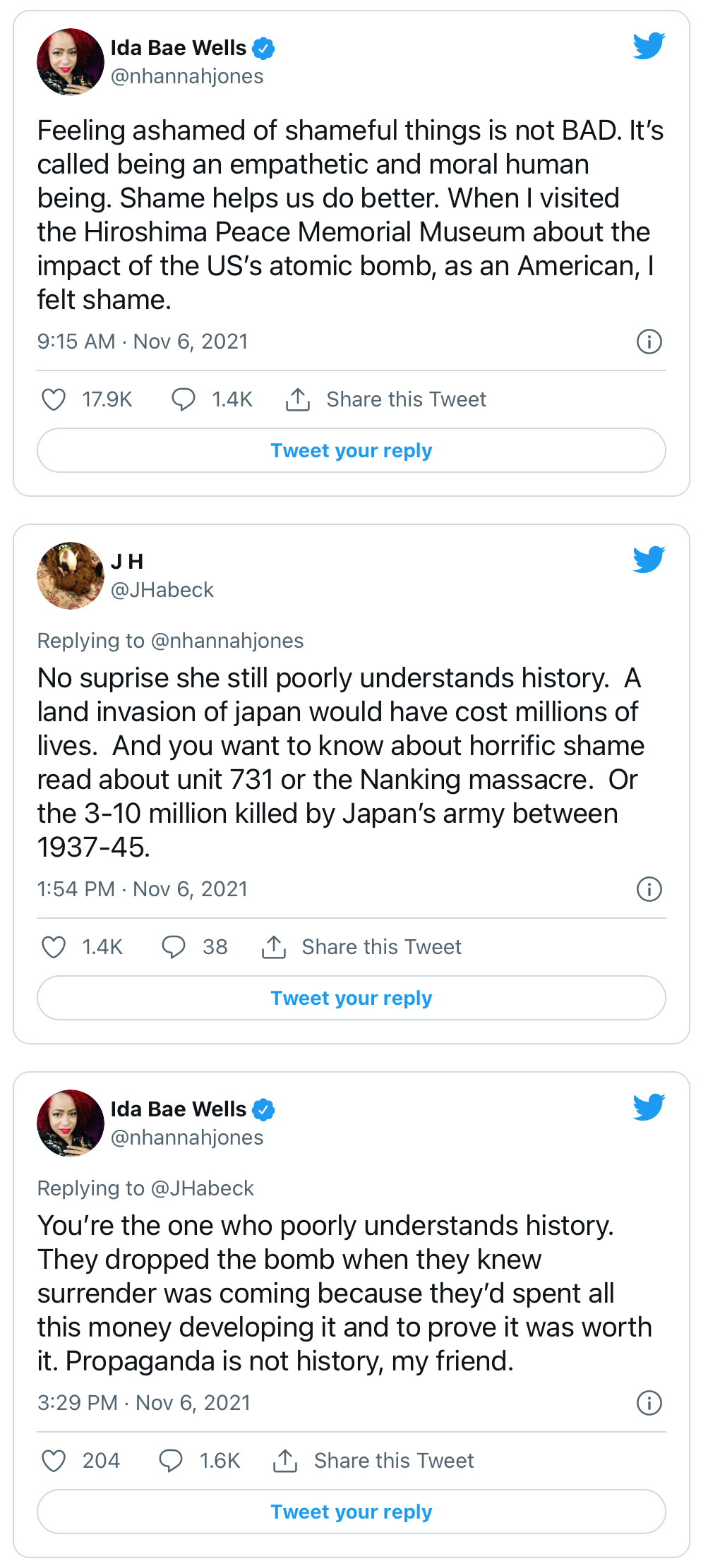 “You’re the only one who poorly understands history,” she tweeted. “They dropped the bomb when they knew surrender was coming because they’d spent all this money developing it and to prove it was worth it.”