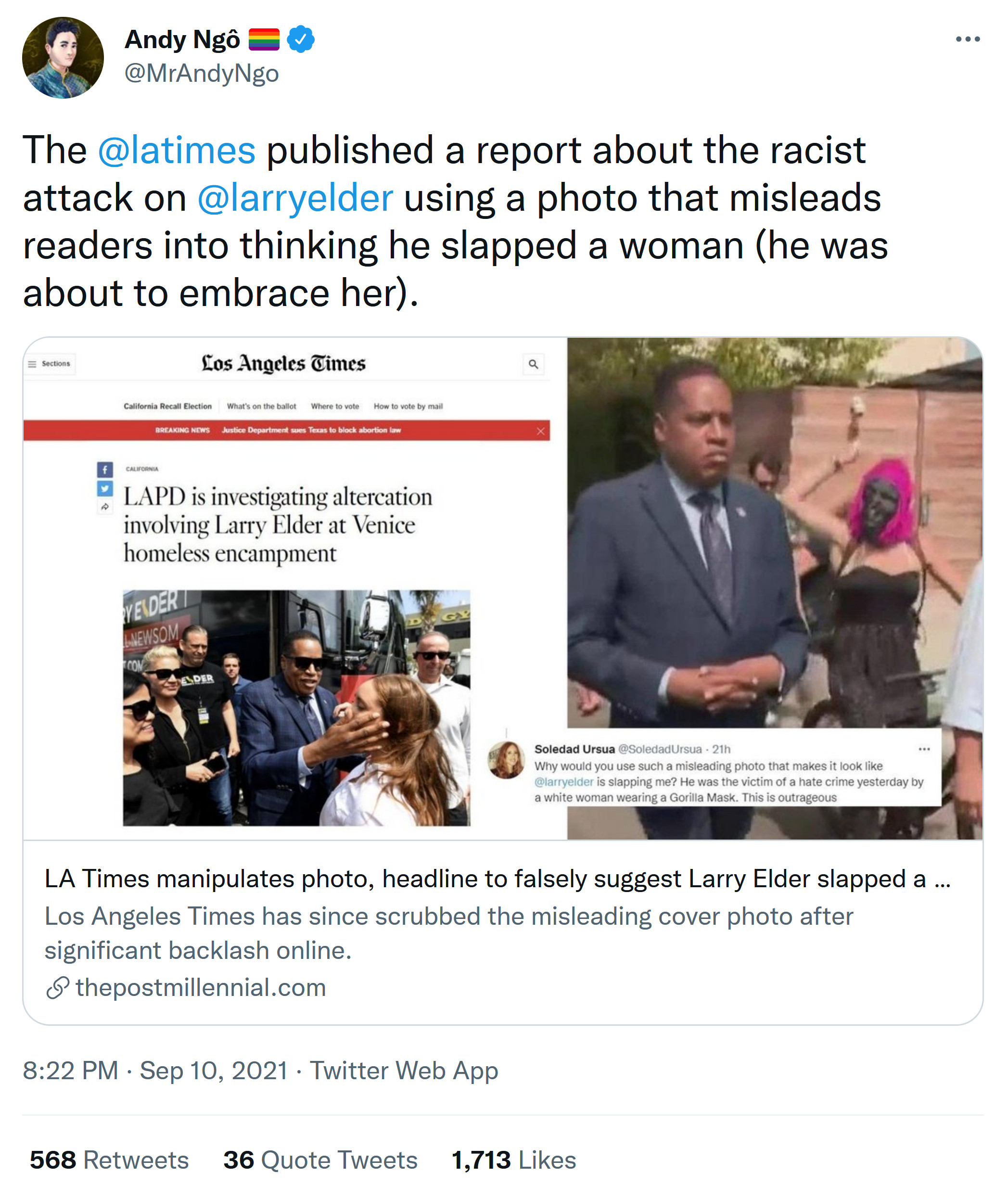THE RACISTS SELF-IDENTIFY: L.A. Times Uses Photo Making It Look Like Larry Elder Slapped a Woman.