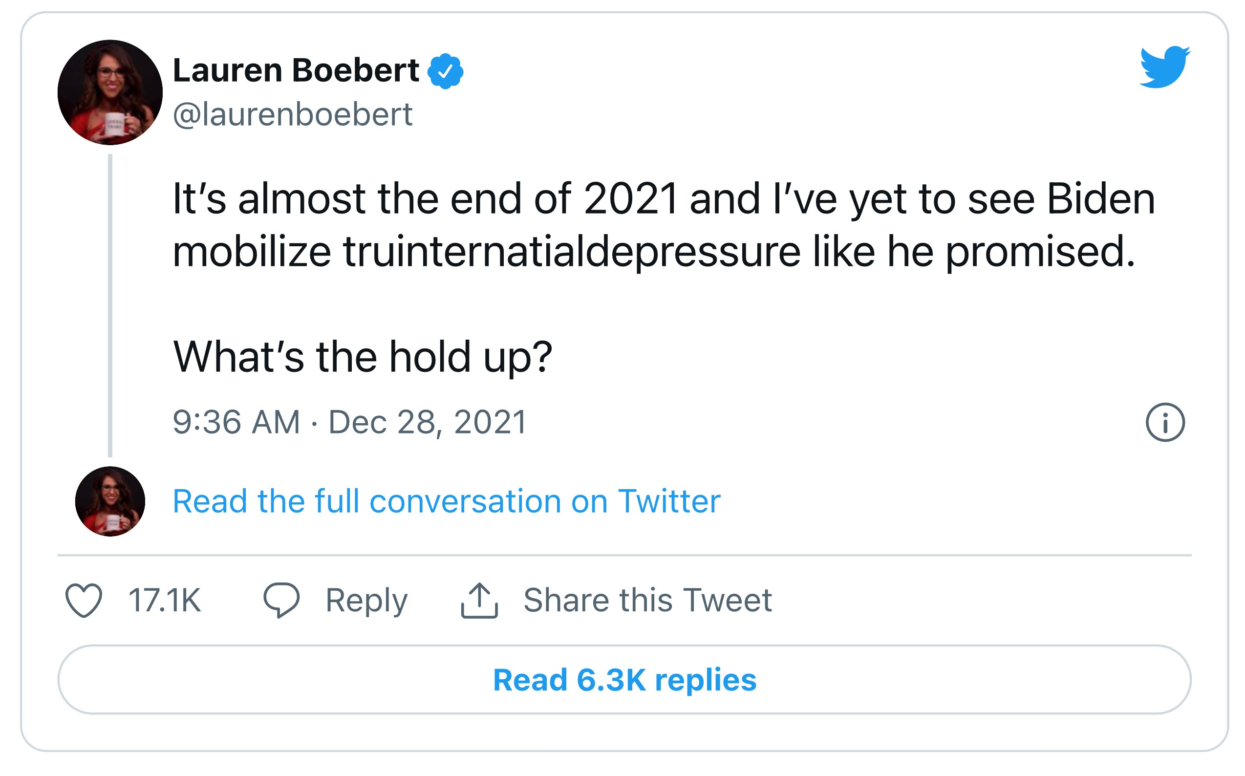 YOU SAY TRUINTERNATIALDEPRESSURE; I SAY TRUNALIMUNUMAPRZURE. LET’S CALL THE JOE THING OFF. Lauren Boebert Tricks the Left Into Exposing Biden With a Savage Troll: