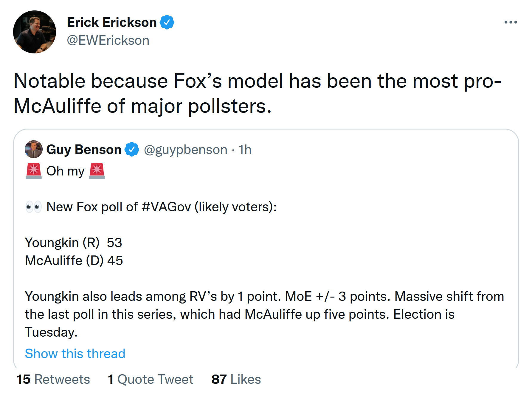 DON’T GET COCKY, BUT WOW: Holy cow: Youngkin 53, McAuliffe 45 in new Fox News poll. “Just an astounding shift on a key issue in a short period, assuming Fox’s numbers are accurate. I wonder if in hindsight we won’t look back and say that McAuliffe lost the election when he said at that debate last month that parents shouldn’t be telling schools what to teach. That teed up Youngkin for a month of ads about McAuliffe wanting to disempower parents’ authority over their children’s education, apparently to devastating effect.”