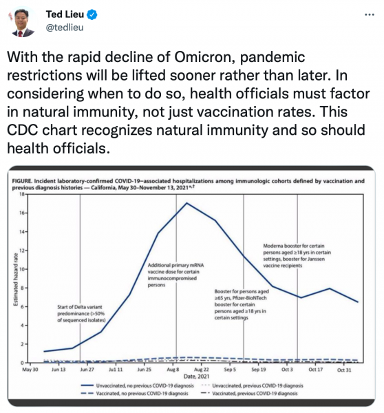 Or as Ian Miles Cheong tweeted, “Polling must be really bad for Ted Lieu, of all people, to call for the recognition of natural immunity and an end to restrictions.”