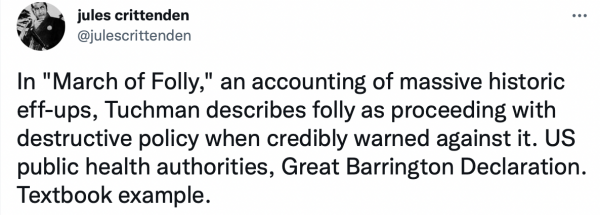 Jay Caspian Kang, writing in The New Yorker, also wants parents to calm down and lower their expectations. Parents’ anxiety has been stoked by “the constant stream of stories about falling ACT and SAT scores, learning loss, and a generation of children who, absent some large-scale intervention, may fall well short of expectations.” But, don’t worry, because affluent, white students also did worse. And you wouldn’t want Democrats might get the blame, would you?