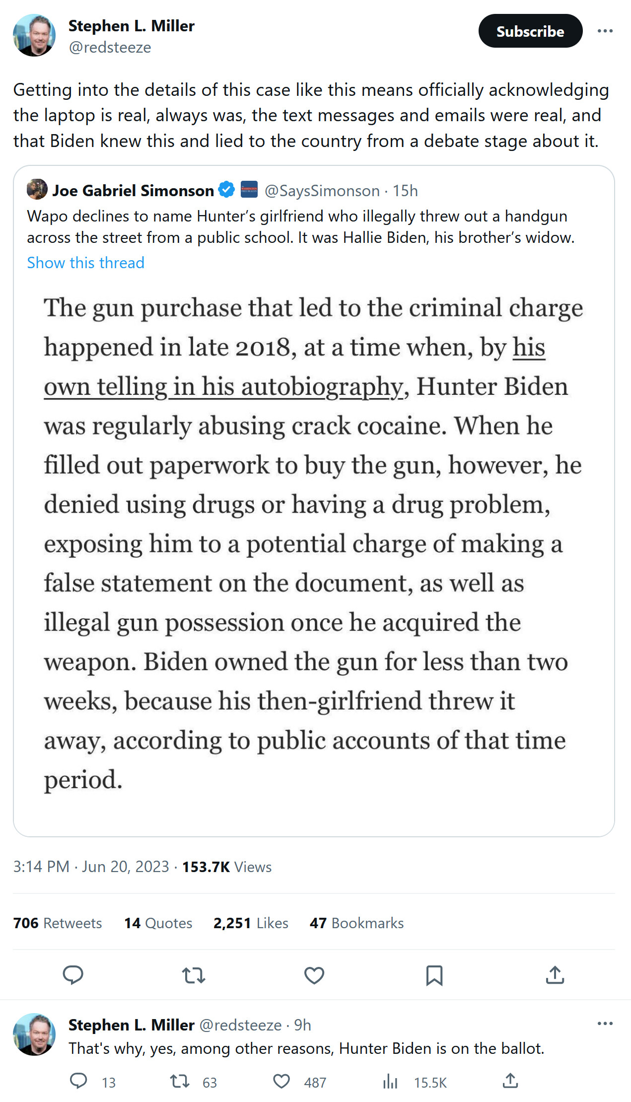 A Washington Free Beacon review of emails, photographs, and text messages from Hunter Biden’s abandoned laptop* reveals a series of chaotic days that led up to his trip to the gun store and provides further evidence that Hunter Biden was an active drug user at the time of his gun purchase.