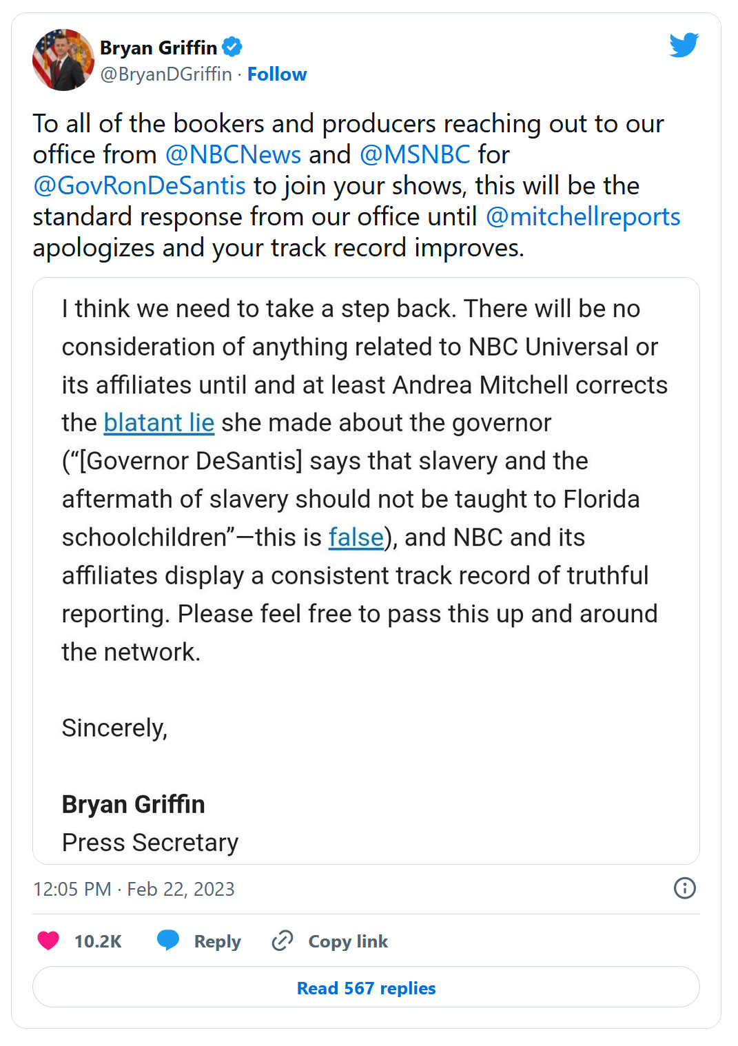 She was “imprecise” in her language, and Gov DeSantis is “not opposed to teaching the FACT [emphasis hers] of slavery in schools,” but the “governor opposes” books that “historians and teachers say…” argle-bargle-BS-bargle. She’s trying to do an end run while doubling down, and DeSantis Deputy Press Secretary Jeremy Redfern truth nails her, brutally.