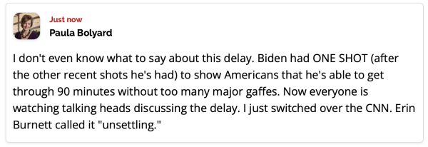 It was a rough start, for sure. Biden sounded hoarse at times, coughed quite a bit, and sounded like he had cotton in his mouth and nostrils. But, it was a campaign speech through and through. He repeated the same old stump speech lines that we’ve heard over and over and that haven’t resonated with the public.