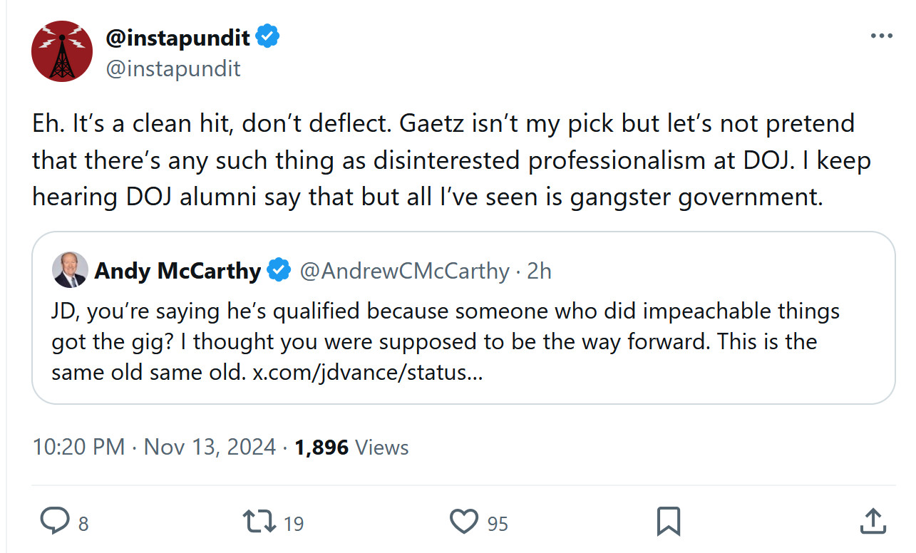 That’s all very interesting. But my primary concern is whether Gaetz will deweaponize DOJ and pursue justice against those who weaponized it.
