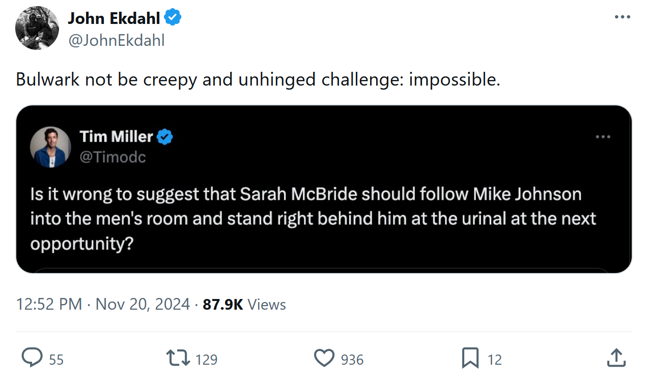 UPDATE: Bulwark still conserving conservatism most conservatively: Tim Miller Imagines Sarah McBride at the Urinal Next to Speaker Johnson in Weird Scenario.