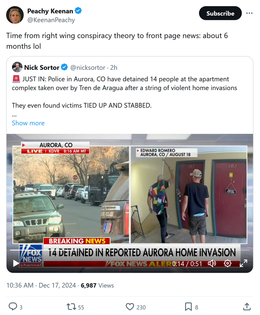 Aurora Police Department Chief Todd Chamberlain said during a Tuesday news conference that 13 to 15 people, mostly males with some females, entered an apartment where two people were inside. Police say the suspects took the migrant victims to another apartment at the same location, where the victims were “threatened and bound.”