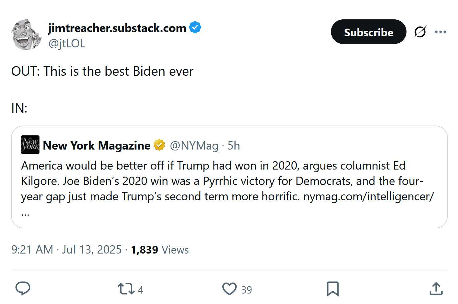 To be fair Kilgore, a former vice president for policy at the Democratic Leadership Council, didn’t buy into Joe Scarborough’s Soviet-level “Best Biden Ever” rant, but he did sound like Biden was probably fine for another four years. In February of last year, he wrote, “An Old Guy’s Defense of Our Old-Guy President:”