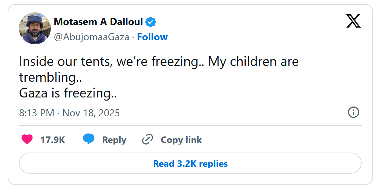 The above was posted when it was 65 degrees at night (and 80 during the day), just to give you an idea of the kind of propaganda being spewed. For years, the above account has claimed to be reporting from the ground in Gaza. He’s made hundreds of posts pushing fake claims about genocide, famine, and his own supposed hardships. In reality, his account was created in the United Kingdom, and he’s currently residing in Poland.