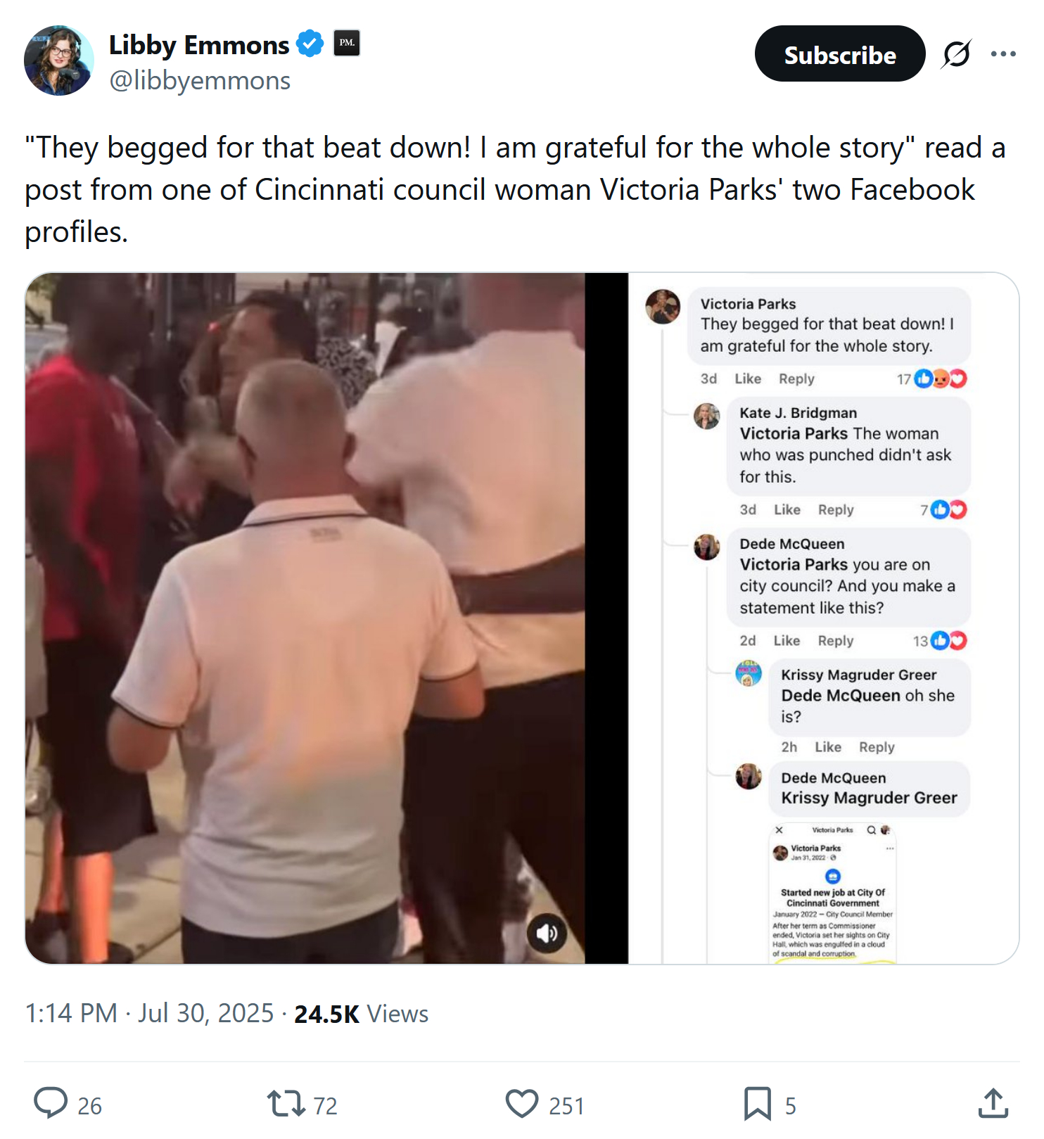 President Pro Tem of the Cincinnati City Council Victoria Parks commented that the white couple who were mercilessly beaten on the streets of her city “begged for that beat down.” The comments came after she saw video of what led up to the beating in the early morning hours of July 28, showing two men starting to fight while others attempted to break it up.