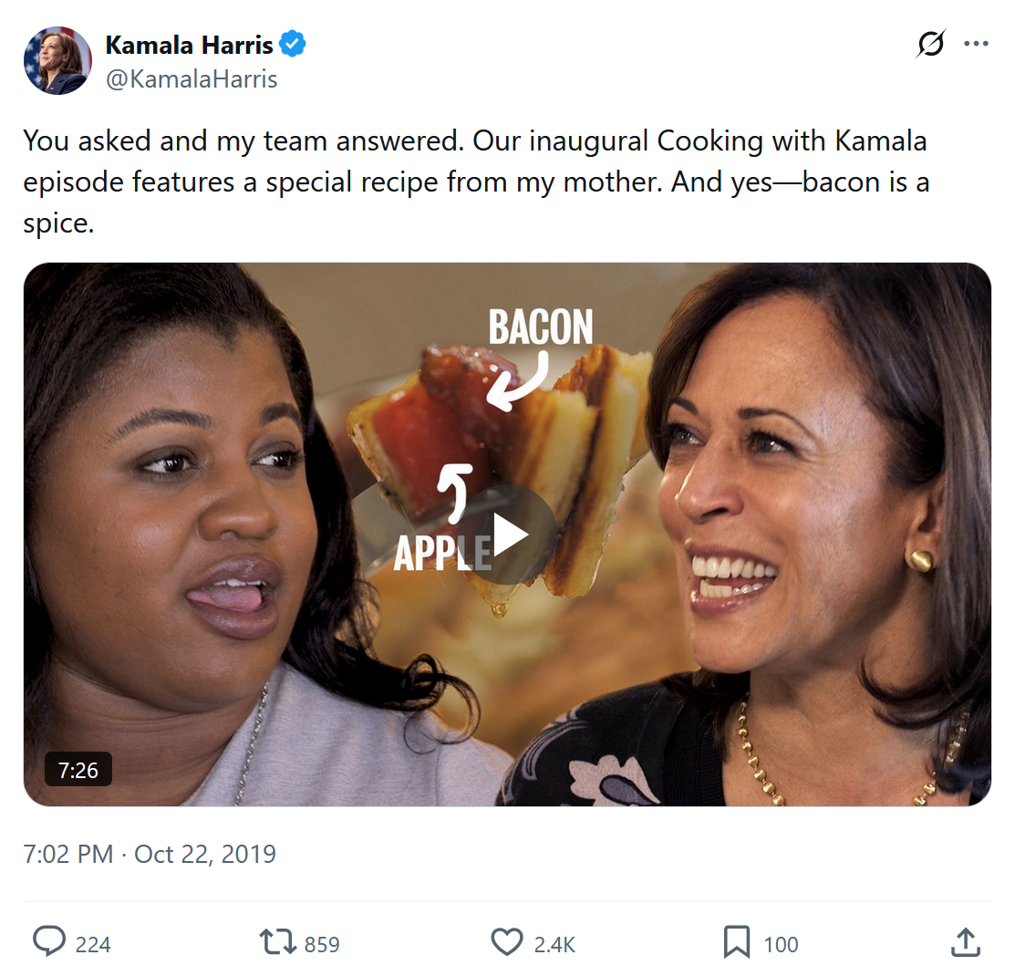 That moronic “bacon is a spice” quote is a cliché that Harris has used several times in the past, such as in this October 2019 tweet: