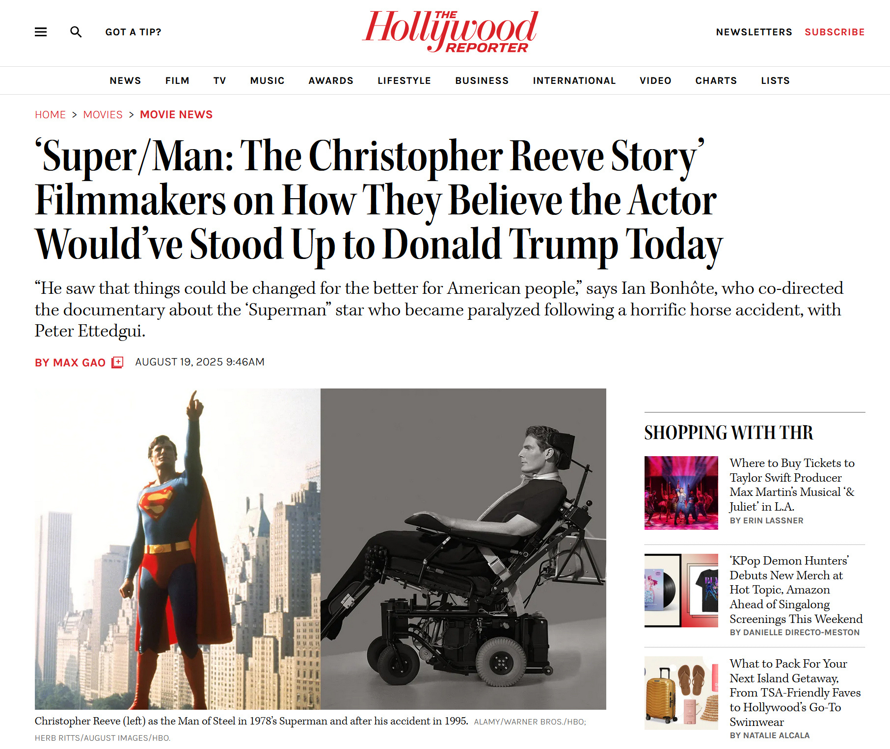 STAND UP CHRIS, LET ‘EM SEE YA! Actual Hollywood Reporter Headline: ‘Super/Man: The Christopher Reeve Story’ Filmmakers on How They Believe the Actor Would’ve Stood Up to Donald Trump Today.