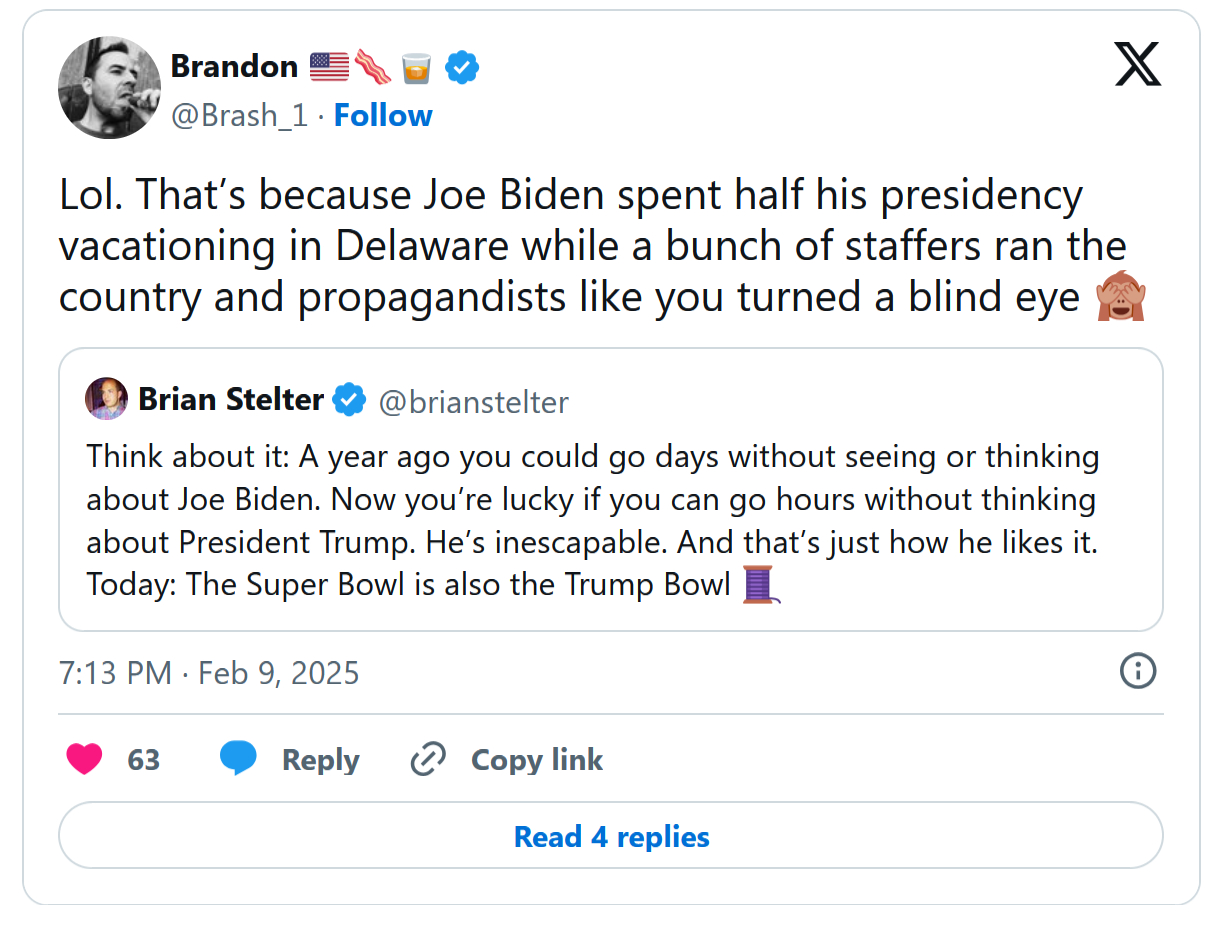 But beyond the dunks, it was interesting to see Stelter suggest that not seeing the president for long stretches of time was actually a good thing, when that was one of the core problems with Biden’s presidency: That he was an absentee president, wasn’t present half the time, and even when he was, he didn’t appear to be all there – which is when his handlers stepped in.