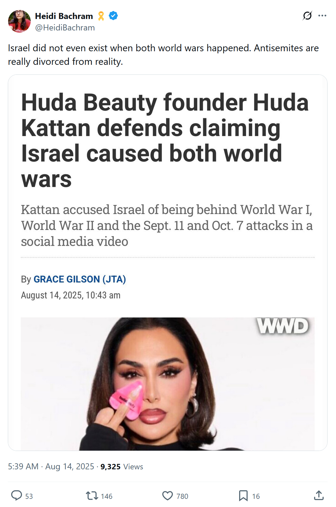 GREAT MOMENTS IN TIME TRAVEL: Makeup boss Huda Kattan claims Israel was responsible for both world wars, 9/11 and October 7.