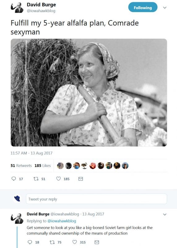 If they need some pickup lines, they can borrow them from Iowahawk goofing on the New York Times’ insane “Why Women Had Better Sex Under Socialism” story in 2017: