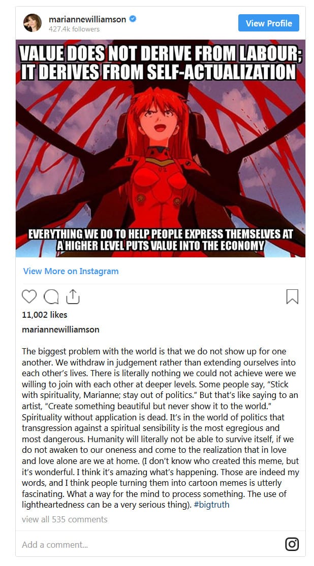 MAKE AMERICA ANIME AGAIN: Marianne Williamson’s new campaign strategy: critical reads of Neon Genesis Evangelion.