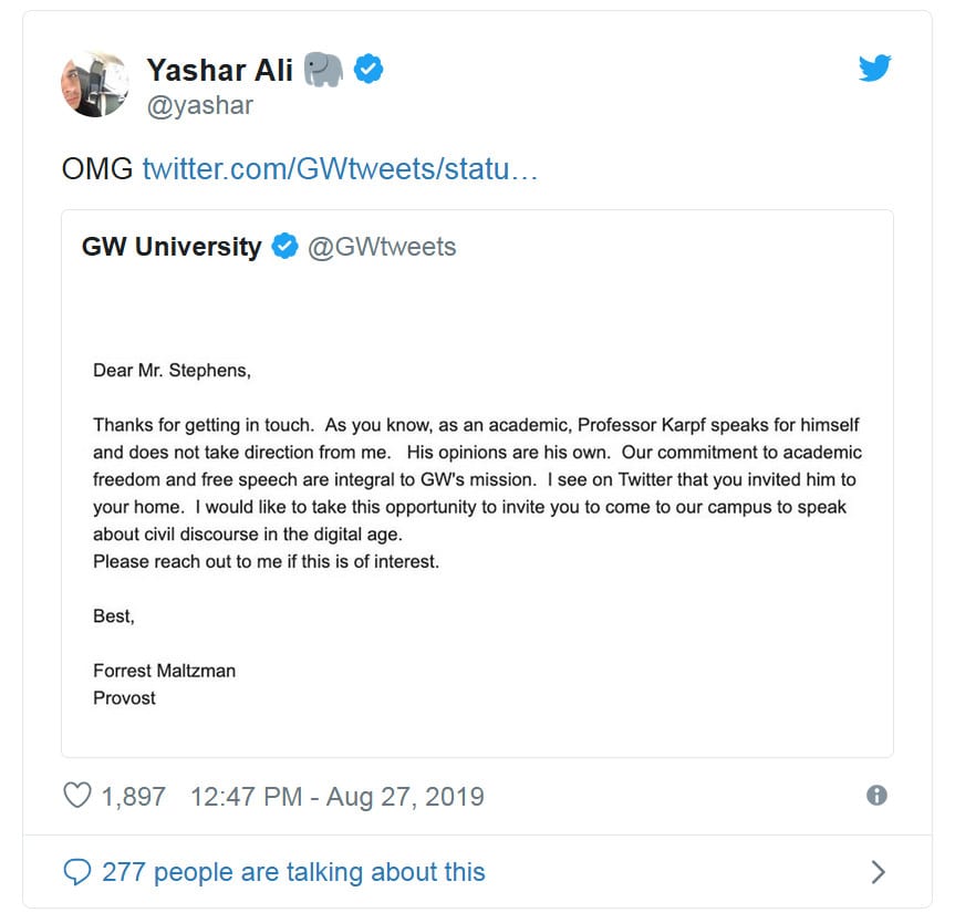 How did the provost respond? Just. Keeps. Getting. Better!’ GWU provost responds to Bret Stephens’ attempt to get professor in trouble over ‘bedbugs’ comment: