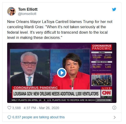 In similar fashion, we saw this appearance by LaToya Cantrell who was on CNN to discuss the issue of her city dealing with its outbreak of the coronavirus. There was a spike in cases in the New Orleans area following the annual Mardi Gras parade, and the surrounding events. In being asked about this Cantrell had a handy excuse; President Trump is to blame.