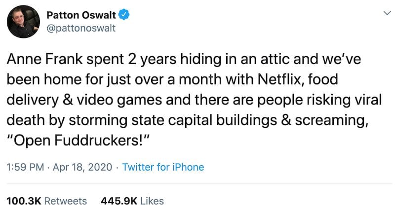 As Jim Treacher writes, “There’s a lot to unpack here, as the kids say. Or three things, at least. So let’s get to it.” Not least of which, “Patton Oswalt is not Anne Frank, so he’s right about that.” Read the whole thing.